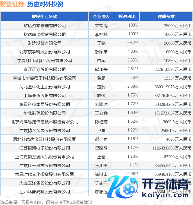 本站音书,把柄天眼查APP露出,财达证券(600906.SH)新增沿途对外投资事件,被投资公司为宣城市华菱精工科技股份有限公司,法定代表东谈主黄超,投资占比为2.4%。该公司从事通用设立制造业,注册成本为13334万东谈主民币。现在,财达证券共存在对外投资26项,投资占比前20的花式见下表: