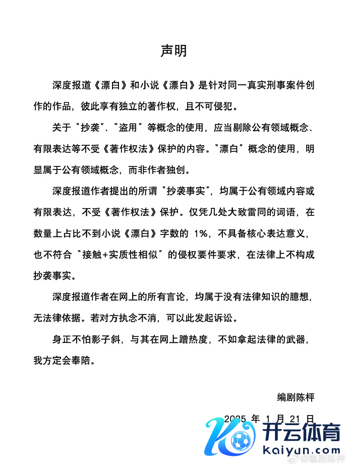 1月21日下昼,陈枰在外交平台再次回应称,深度报谈《漂白》和演义《漂白》是针对并吞真确刑事案件创作的作品,彼此享有孤苦的文章权,且不可扰乱。